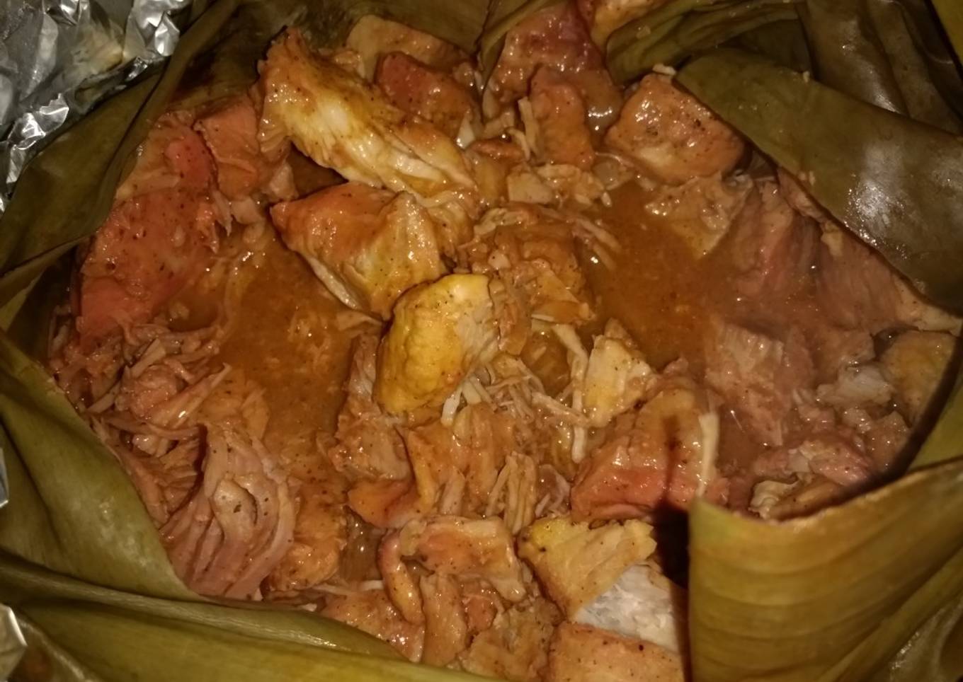 - Lavamos nuestra olla express y le ponemos por dentro papel aluminio y después las hojas de plátano, de ahí le echamos la carne con el caldo ya colado y las hojas de pimienta lavadas y envolvemos