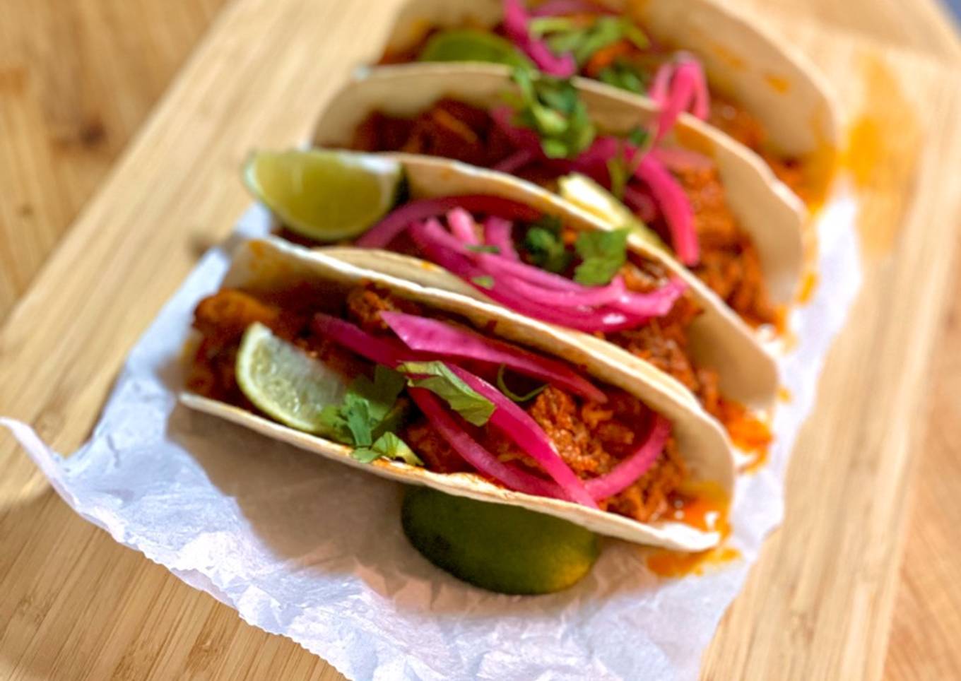 - En el momento de servir, rellena las tortillas de tacos con tu carne de cochinita pibil, pon un poquito de cebolla encurtida, cilantro fresco y un gajo de lima para que cada uno le ponga en función de si le gusta o no y a comer ¡Espero que os guste!