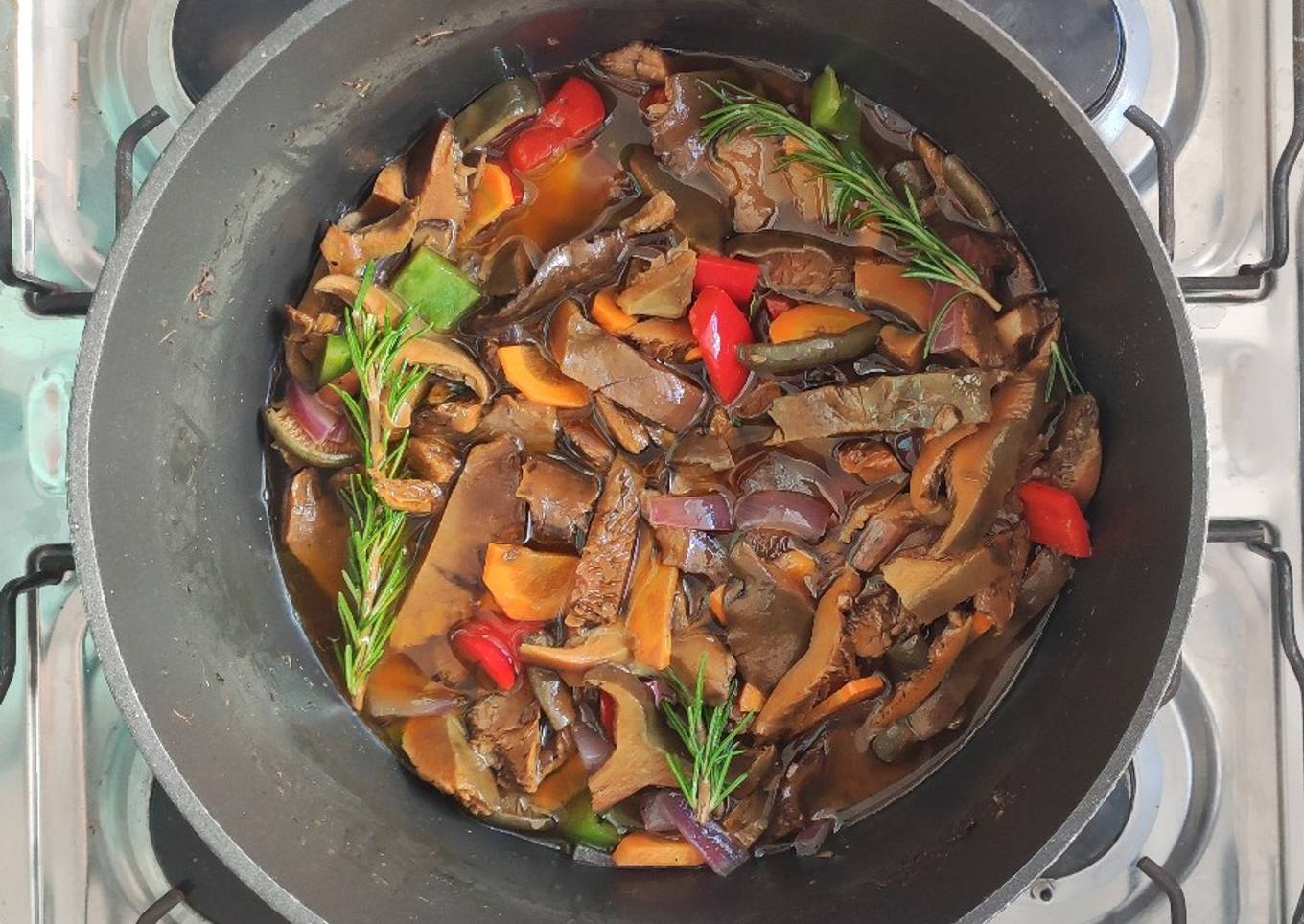 Revolver unos minutos. - Agregar el vinagre, agua filtrada, romero, ajo, zanahoria, hojas de laurel y hongos.