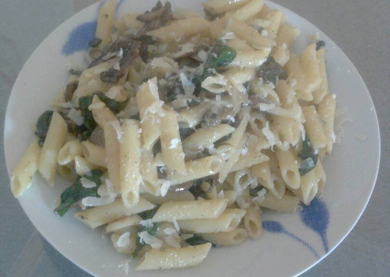 Pasta con champiñones, espinacas y queso
