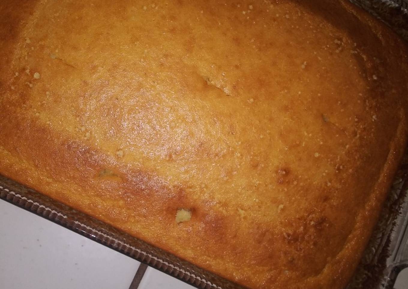 - En un molde para hornear ya engrazado agregamos nuestra mezcla de elote y precalentamos el horno a 360°F lo llevamos al horno por 45 minutos. Recuerda estar chequiando el pan. Con cuidado por que no todos los hornos calientan igual. SI EL TUYO ES ELÉCTRICO USA LA TEMPERATURA 400°F.