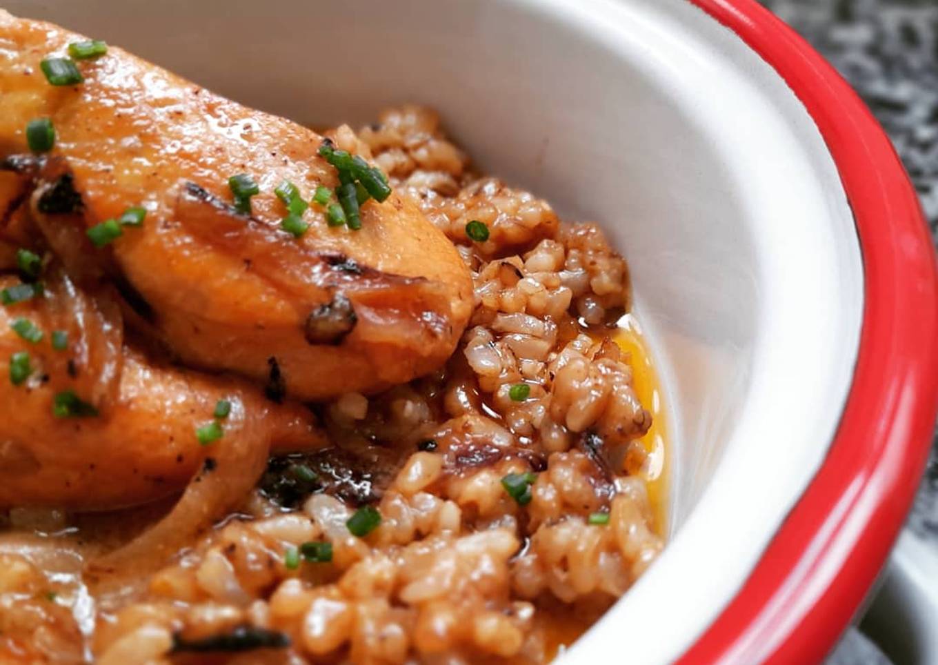 Pollo en salsa de mostaza y leche de coco con arroz integral