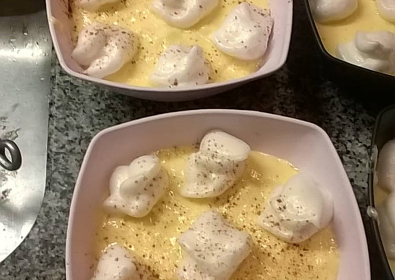 - Finalmente ya se nos cocino el arroz, espesandose también, vamos a continuar con el arroz en el fuego y le vamos a añadir las yemas bien batidas, revolviendo y haciendolas cocinar, luego añadimos la mitad aprox del merengue y revolvemos suave para que no pierda lo espumoso, retiramos si se desea las cáscaras de naranja y los clavitos. Apagamos el fuego y pasamos a llenar los bols de postre, decoramos con merengue, hacemos copitos o el decorado que más nos guste y espolvoreamos con canela.