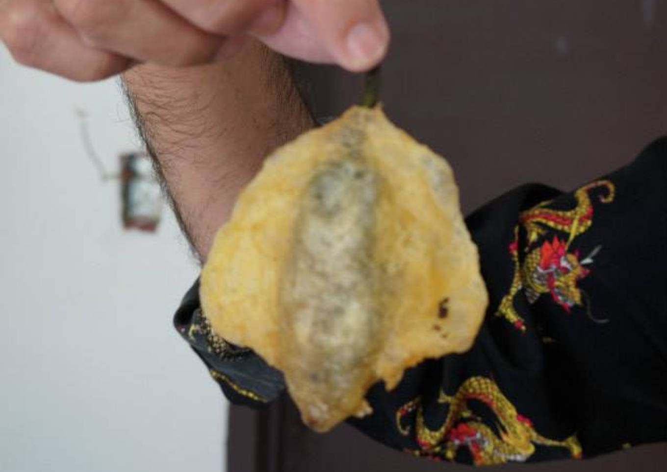 Chile jalapeño capeado mariposa relleno de pasta de camote, durazno, manzana, chía, cahuate, y chaya