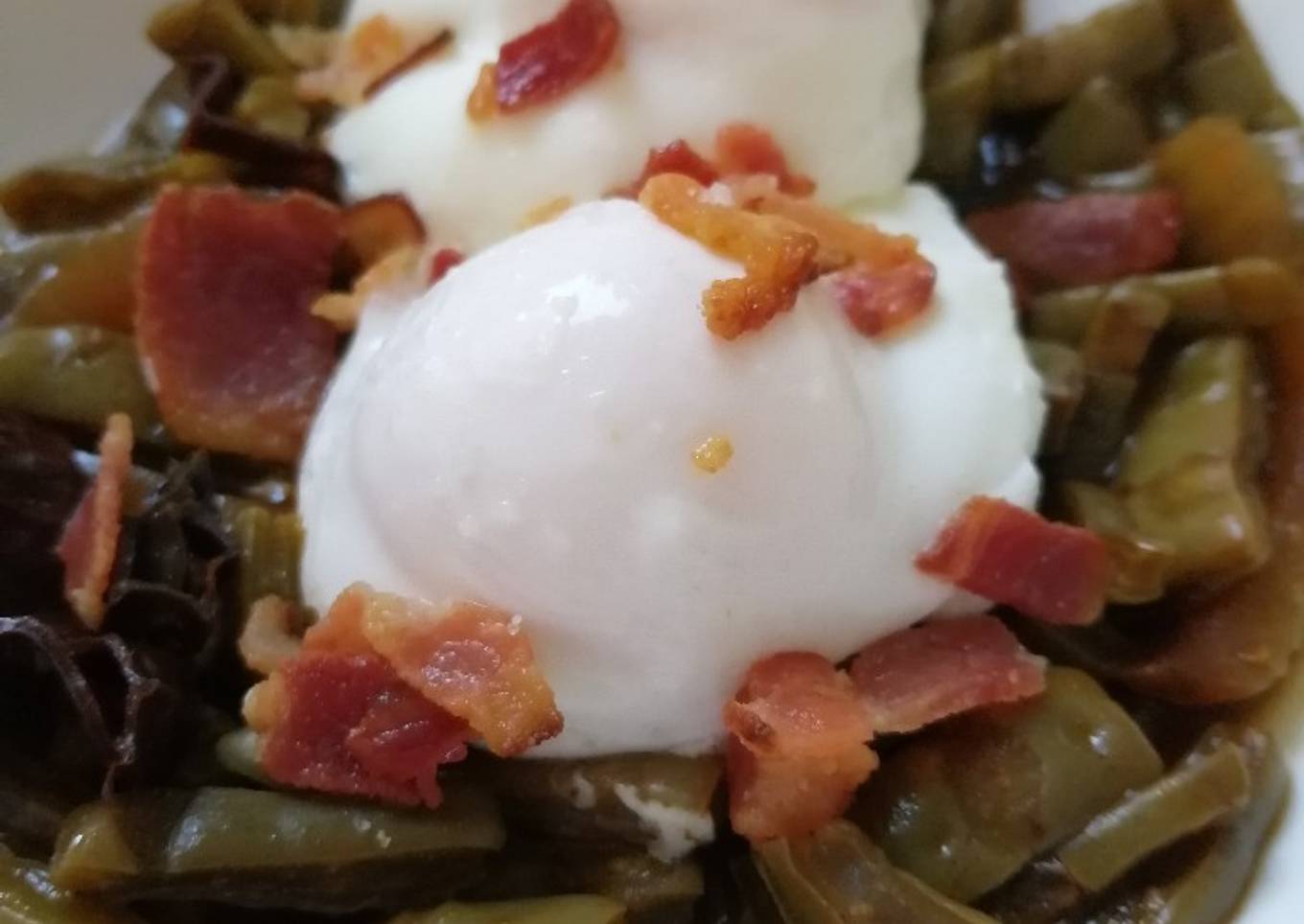 - Ahora montamos el plato, ponemos los nopales guisados, los huevitos que vamos a sacar con cuidado con una cuchara, y de último los trocitos de tocino, a desayunar 😋