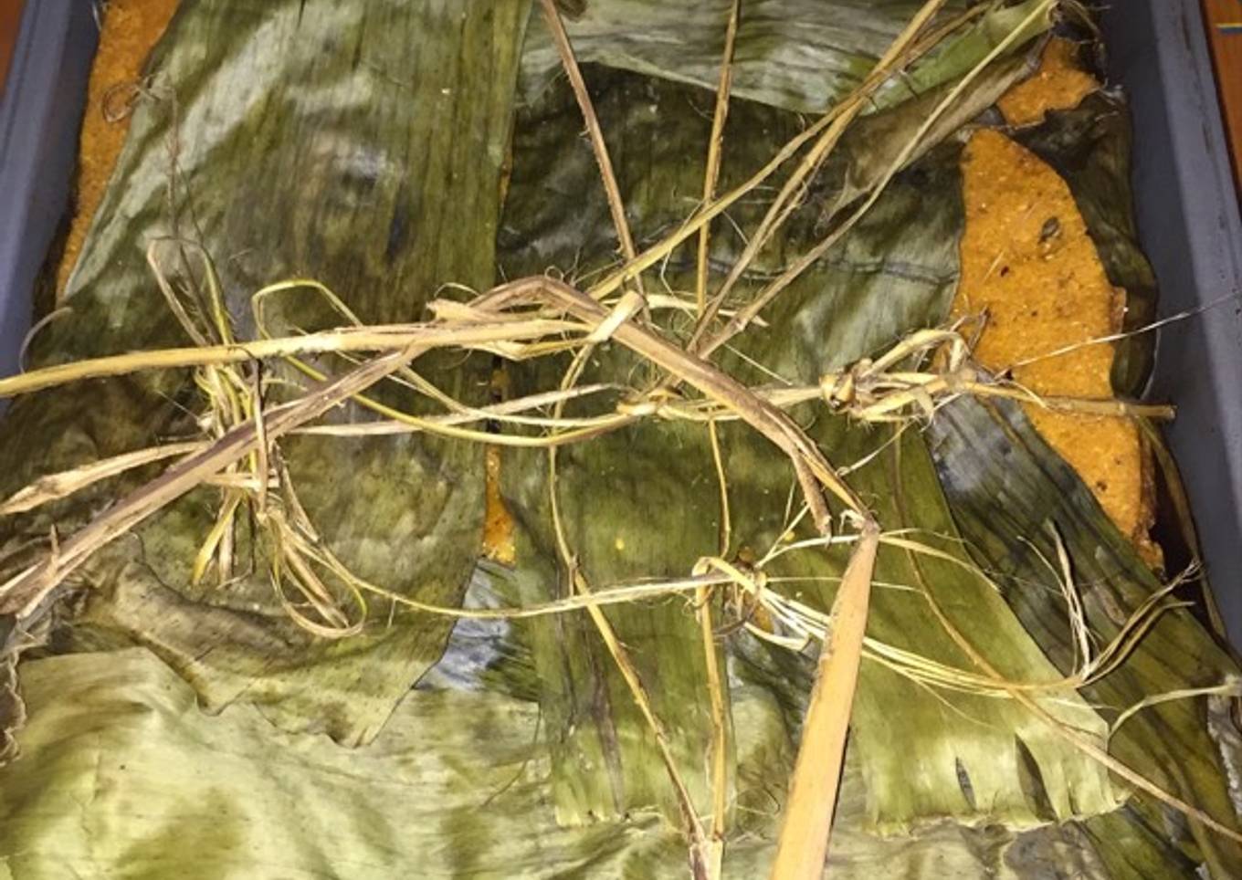 - Formamos en una hoja la tapa y cubrimos el pib. Cubrimos con más hoja de plátano y llevamos a hornear a 180 grados por aproximadamente 2 horas.