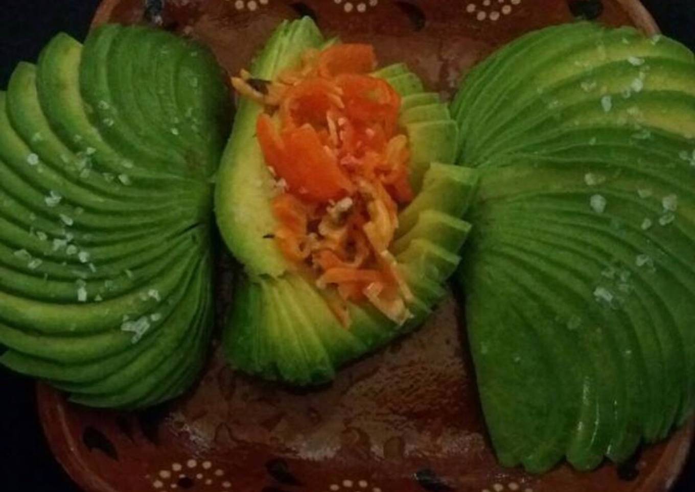 - Acomodar los abanicos de aguacate en el centro colocar el chile habanero ya macerado con el aceite y pimienta