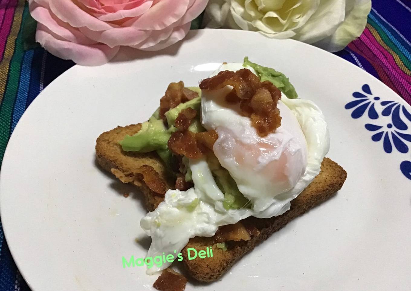 - Untar una tostada con aguacate, agregar tocino, huevo y salsa picante al gusto