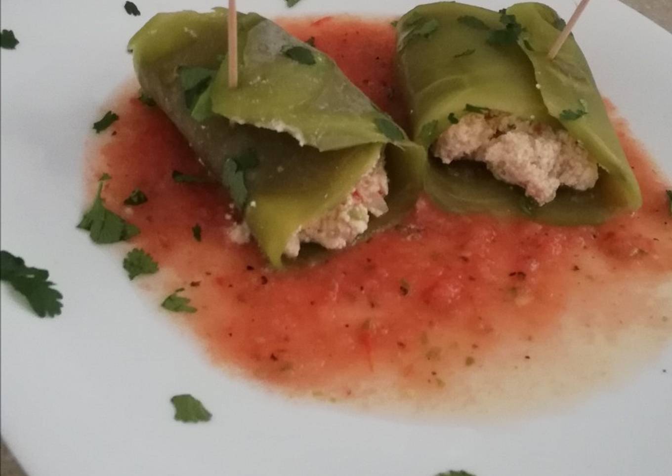 - Sirve en un plato la salsa anterior y encima coloca los taquitos y los decoras con el cilantro.